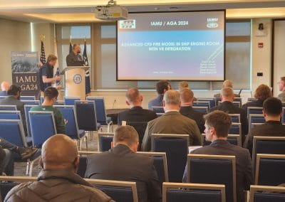 Progress on the INNO2MARE Pilot project 1 was presented at the conference by the researchers from the Faculty of Maritime Studies Rijeka, Croatia. A lecture, „Advanced CFD Fire Model in Ship Engine Room with VR Integration“, was given as a part of the conference program. Also, a practical demonstration of achieved results was given where participants of the conference waited in line to try the VR application of firefighting training within the ship engine room. Valuable comments for further work were gathered from professionals dealing with maritime education and training on the global scene.
