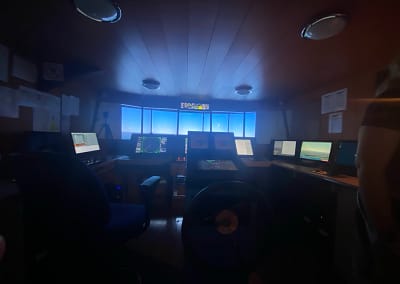 Next, we explored another impressive simulator lab — this one dedicated to ship bridge simulation and control.Here, we observed master’s students working on real-time research projects using a ship bridge emulator setup that closely mirrors actual ship operations. The immersive, highly realistic environment stood out as a highlight of the visit.