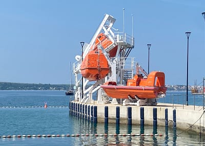 To conclude the tour, we walked down to a small educational marine port located right on the beach, just steps away from the main building. This practical facility adds further depth to the hands-on training opportunities offered at the faculty. The educational port included a small dock where students can get hands-on experience piloting different vessels, as well a training set-up to train students in the use of various evacuation systems often present on board ships.