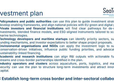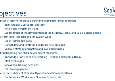 The SeaTecHub project pursues several strategic objectives: facilitate long-term cross-border and inter-sectoral collaboration to advance eco-innovative maritime technologies , perform joint research to close knowledge gaps and reinforce collaboration between all quadruple-helix actors, implement mutual learning and skills development measures, raise the visibility of the Croatian and Cypriot innovation ecosystems through targeted networking and knowledge-exchange events.