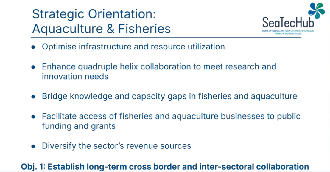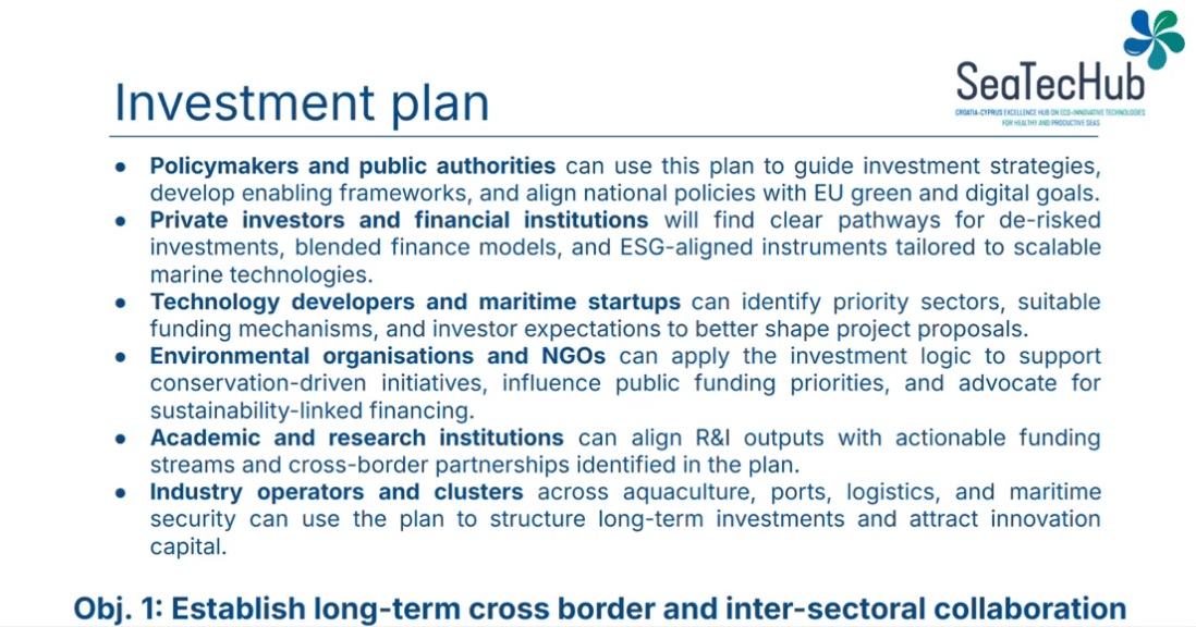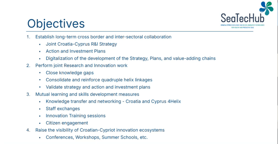 The SeaTecHub project pursues several strategic objectives: facilitate long-term cross-border and inter-sectoral collaboration to advance eco-innovative maritime technologies , perform joint research to close knowledge gaps and reinforce collaboration between all quadruple-helix actors, implement mutual learning and skills development measures, raise the visibility of the Croatian and Cypriot innovation ecosystems through targeted networking and knowledge-exchange events.
