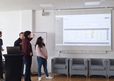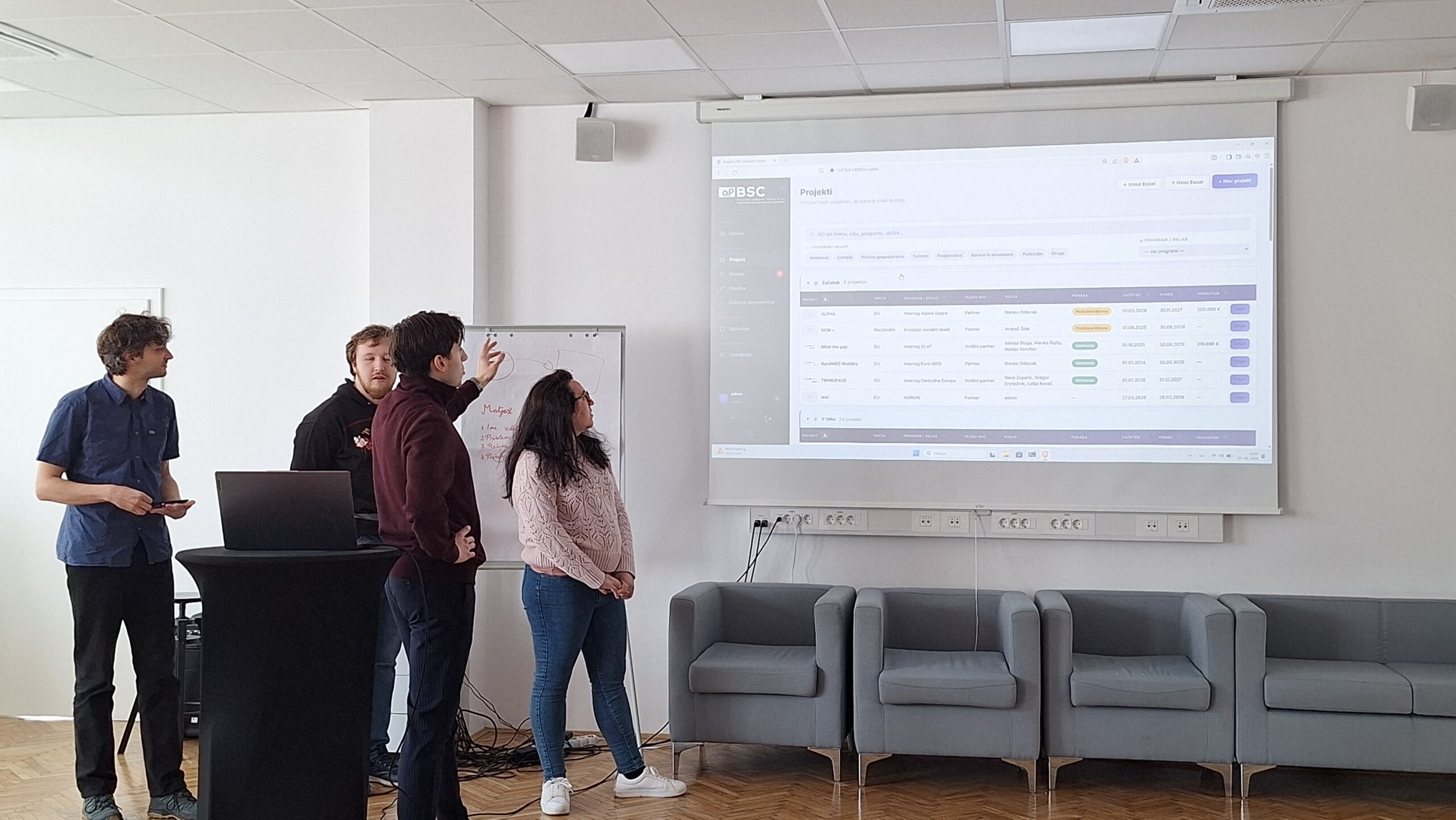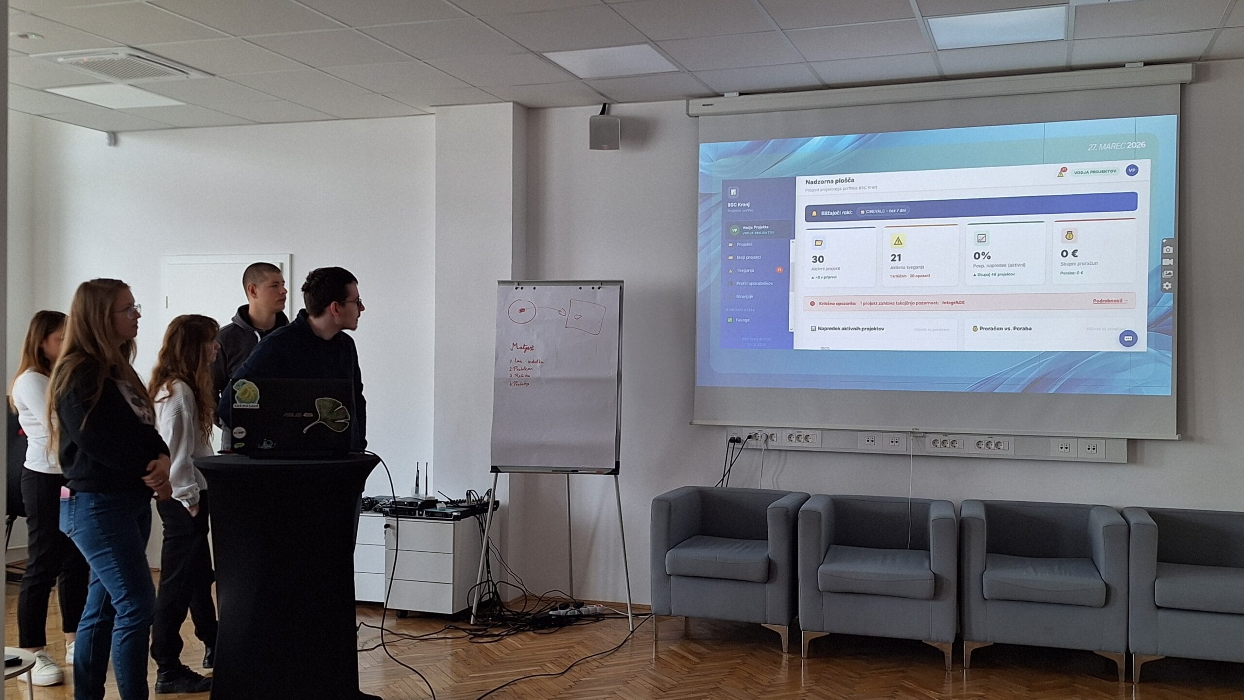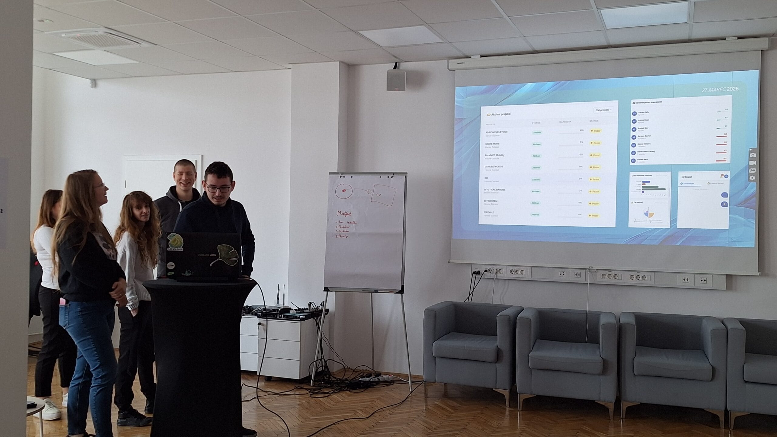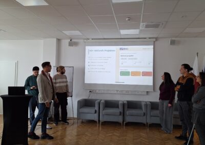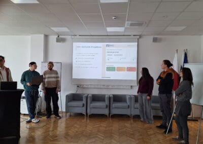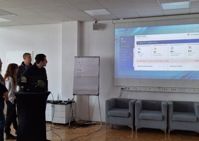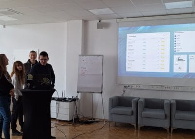 The first round of project presentations took place at the end of March at Kovačnica, the entrepreneurial incubator in Kranj. Participants developed applications aimed at improving project management processes within organisations, with a focus on transparency, early risk identification, and informed decision-making. The solutions demonstrated a strong emphasis on usability, efficiency, and innovation.