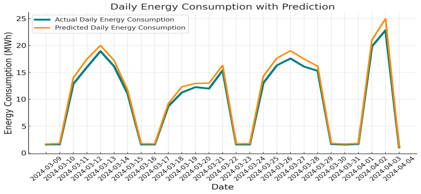 To improve accuracy and temporal alignment, attention mechanisms were introduced, allowing the model to focus on the most relevant time steps when generating forecasts. This was followed by the development of a Transformer-based model, which significantly improved the system’s ability to capture complex seasonal trends, sharp peaks, and irregular consumption patterns—especially across production shifts and energy generation variability.
