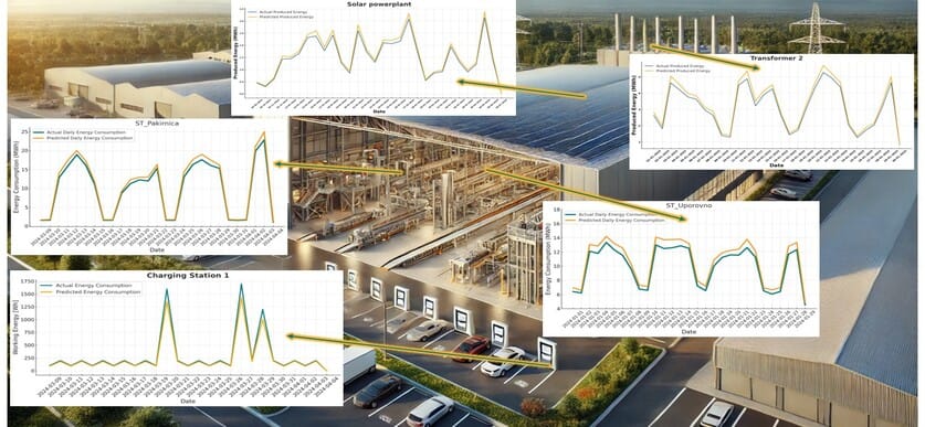 The development of predictive models has followed a progressive path, moving from basic architectures to advanced ensemble methods. Initial experimentation began with stacked LSTM networks, which provided a solid baseline for capturing temporal patterns in energy data. Building on this, the team implemented an encoder-decoder LSTM architecture, enabling multi-step forecasting over a 48-hour horizon. Figure 6 presents results of comparison between predictions and real values for one machine in production line section.